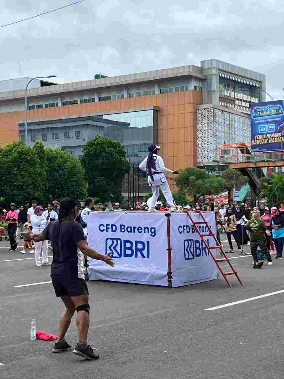 Selain layanan perbankan, BRI Branch Office Bekasi juga menghadirkan aktivitas olahraga bersama yang dipusatkan di area utama CFD. Seorang instruktur tampak memandu peserta dari atas panggung mini bertuliskan “CFD Bareng BRI”.