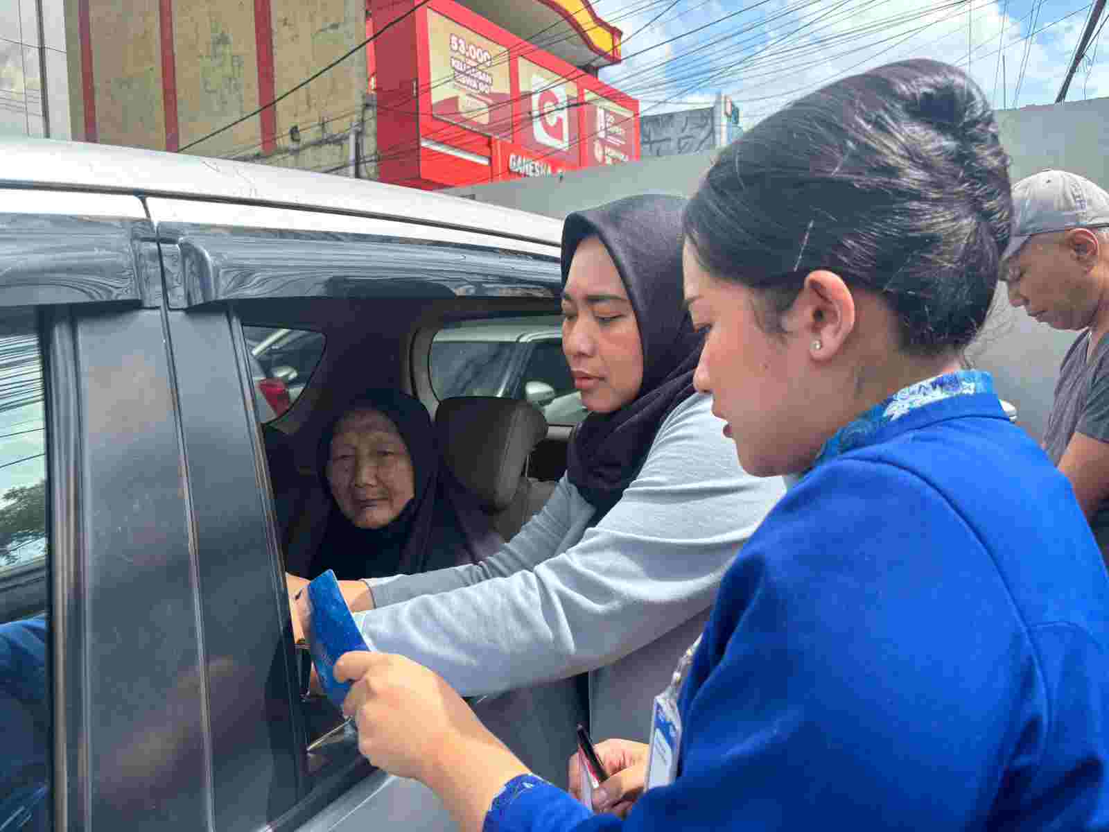 Seperti terlihat pada Senin (9/2/2026), petugas teller BRI kanca Cimanggis, Ainaya Lana Arista H melayani nasabah pensiunan dengan memberikan pendampingan administrasi di dalam kendaraan yang terparkir.