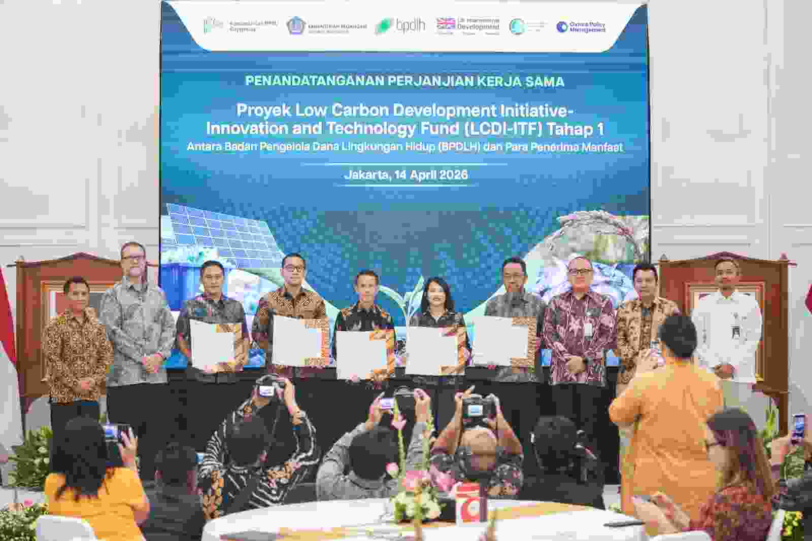 Pemerintah Indonesia melalui Kementerian PPN/Bappenas dan Badan Pengelola Dana Lingkungan Hidup (BPDLH) bersama Pemerintah Inggris melalui Foreign, Commonwealth and Development Office (FCDO) menandatangani Perjanjian Kerja Sama (PKS) dengan empat penerima manfaat untuk implementasi Low Carbon Development Initiative–Innovation and Technology Fund (LCDI-ITF) di Gedung Bappenas, Jakarta, Selasa (14/4). Kegiatan ini menandai dimulainya pendanaan bagi empat proyek inovatif yang mendorong solusi teknologi rendah karbon di berbagai wilayah Indonesia.